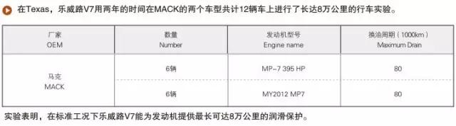 在美國(guó)德克薩斯州,樂(lè)威路V7用兩年時(shí)間在“馬克(MACK)”兩個(gè)車型的12輛車上進(jìn)行了長(zhǎng)達(dá)8萬(wàn)公里的行車實(shí)驗(yàn),證明了在標(biāo)準(zhǔn)工況下樂(lè)威路V7可達(dá)70000KM的超長(zhǎng)換油周期,是混合車隊(duì)的理想選擇。